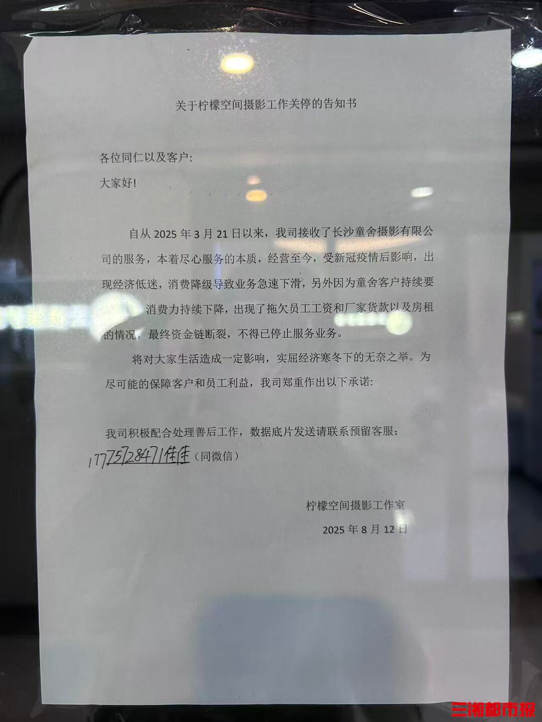 《关停告知书》称,“柠檬影像”自2025年3月21日以来,接收了长沙童舍摄影有限公司的服务,经营至今,受新冠疫情后影响,出现经济低迷,消费降级导致业务急速下滑。另外因为童舍客户持续要求退款,消费力持续下降,出现了拖欠员工工资和厂家货款以及房租的情况,最终资金链断裂,不得已停止服务业务。