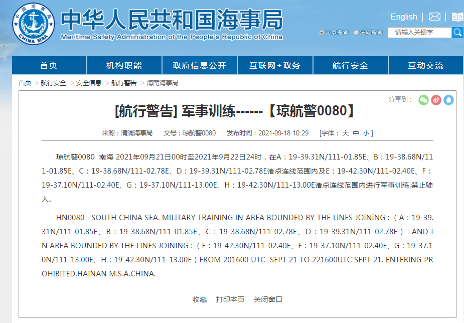 琼航警0080 南海 2021年09月21日00时至2021年9月22日24时,在A:19-39.31N/111-01.85E、B:19-38.68N/111-01.85E、C:19-38.68N/111-02.78E、D:19-39.31N/111-02.78E诸点连线范围内及E:19-42.30N/111-02.40E、F:19-37.10N/111-02.40E、G:19-37.10N/111-13.00E、H:19-42.30N/111-13.00E诸点连线范围内进行军事训练,禁止驶入。
