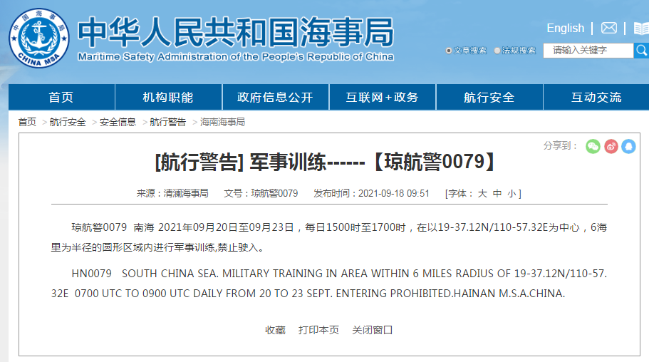 琼航警0079 南海 2021年09月20日至09月23日,每日1500时至1700时,在以19-37.12N/110-57.32E为中心,6海里为半径的圆形区域内进行军事训练,禁止驶入。