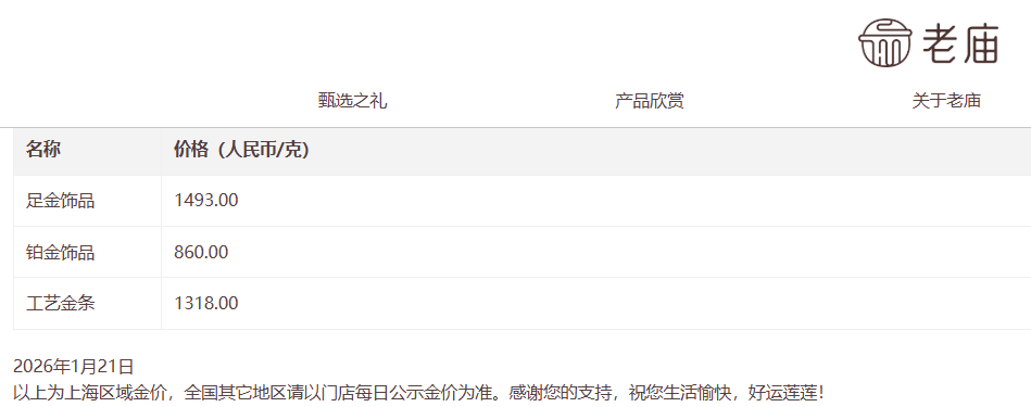 老庙黄金足金饰品报1493元/克,较1月20日1455元/克涨38元/克。