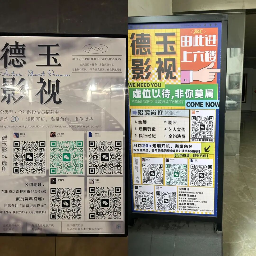 “统筹、剧照、后期剪辑、艺人宣传、执行经纪、全约演员……欢迎投递简历。”在德玉影视所在的商务楼入口及电梯间,均张贴着企业的招聘公告。