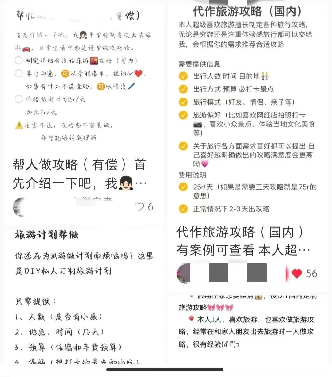 社交平台上出现的代做旅游攻略服务介绍。