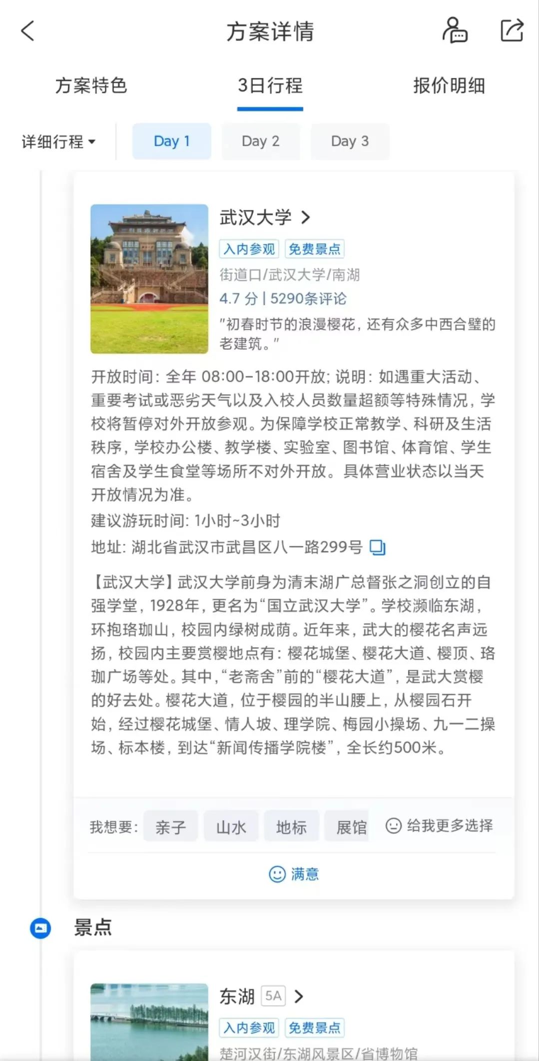 杨琳告诉记者,三个方案大同小异,推荐的景点没有让她特别惊喜。三位规划师为她推荐的旅游目的地多为黄鹤楼、东湖、湖北省博物馆等大众熟知的景点,缺少小众目的地。“这些景点,我本身都知道。请规划师帮忙做方案,肯定想得到一些不同的建议。”