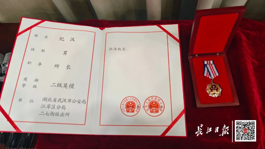 仪式现场庄重肃穆,市公安局党委委员、政治部主任陈孝海首先宣读人力资源社会保障部、公安部《关于追授纪汉等同志“全国公安系统二级英雄模范”称号的决定》。随后,该局党委副书记、副局长刘南华缓步走到纪汉同志遗属身边,将二级英模证书和奖章郑重地送到遗属手中。这份沉甸甸的荣誉,既是对纪汉同志一生奉献的肯定,也承载着对英雄的深切缅怀。