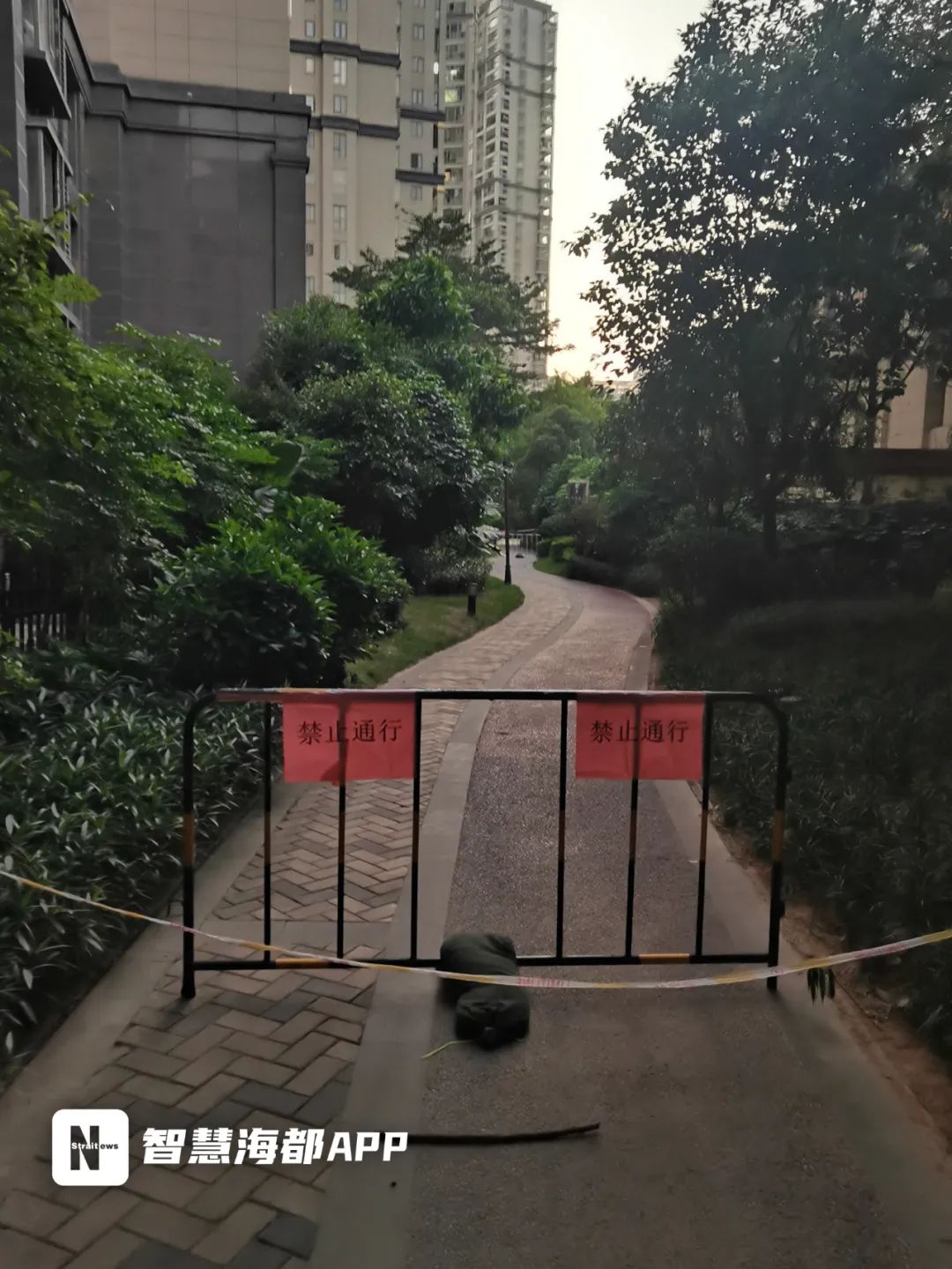 11日17时40几分许,记者来到事发的世茂湖滨首府小区D区的漫跑道,该漫跑道两端已用铁马、警戒线等进行围挡,铁马上贴有上书“禁止通行”的红色纸张。海都记者看到,在该漫跑道靠近楼栋的一侧草地上,间隔安装着高20厘米左右的地灯,其中一个地灯稍有倾斜。