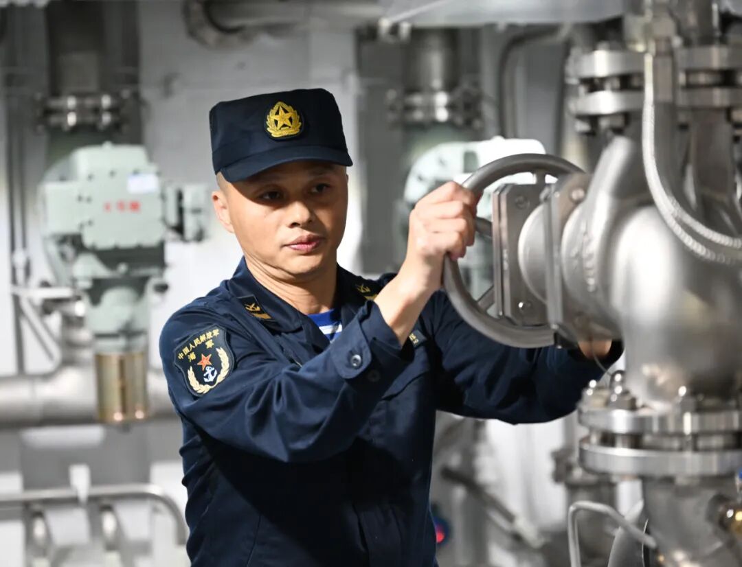 福建舰油料区官兵进行油路检查。解放军报记者 穆瑞林 摄