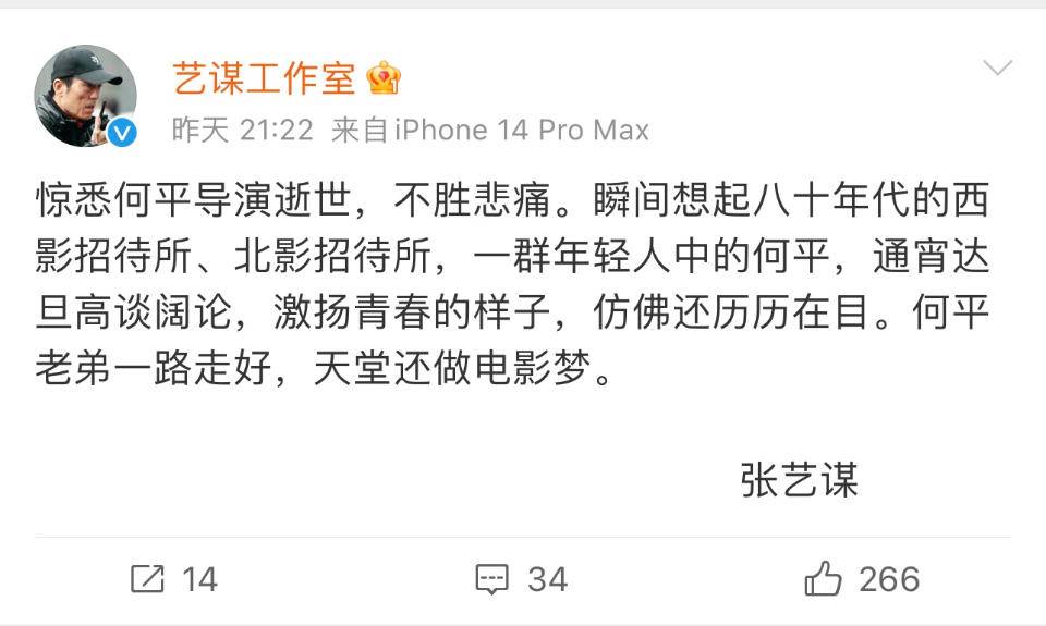 导演张艺谋则在社交平台悼念何平:“惊悉何平导演逝世,不胜悲痛。瞬间想起八十年代的西影招待所、北影招待所,一群年轻人中的何平,通宵达旦高谈阔论,激扬青春的样子,仿佛还历历在目,何平老弟一路走好,天堂还做电影梦。”