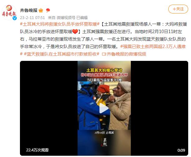 土耳其地震救援现场感人一幕:大妈将救援队员冰冷的手放进怀里取暖