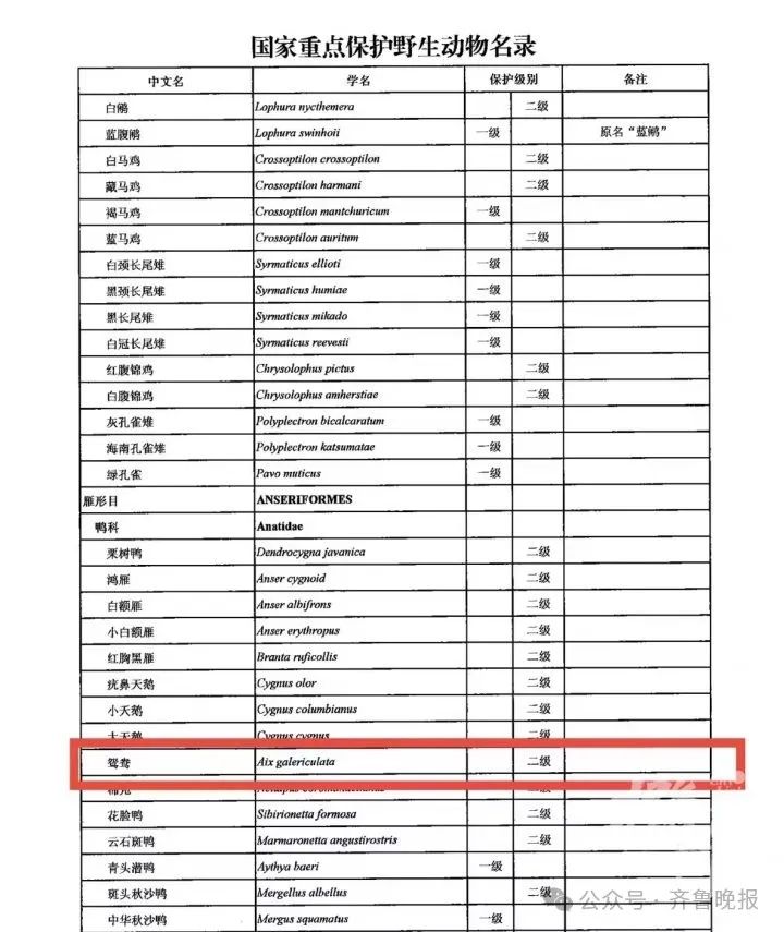 记者了解到,2018年,鸳鸯被列入《世界自然保护联盟(IUCN)濒危物种红色名录》中,等级为无危。2021年,鸳鸯被列入中国《国家重点保护野生动物名录》中,等级为国家二级保护野生动物。