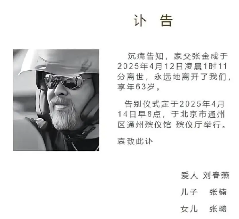此前,4月12日,张金成的儿女对外透露,父亲张金成在12日凌晨1点去世,追悼仪式在4月14日于通州殡仪馆举行。
