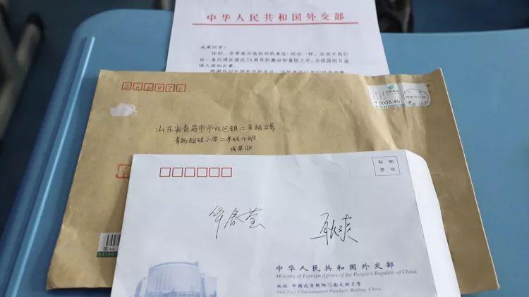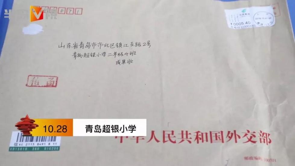 10月23日,一封挂号信来到了青岛超银小学,又通过班主任王娇转交到了成果手上,黄色的牛皮信封上红色的印刷体“中华人民共和国外交部”分外显眼。