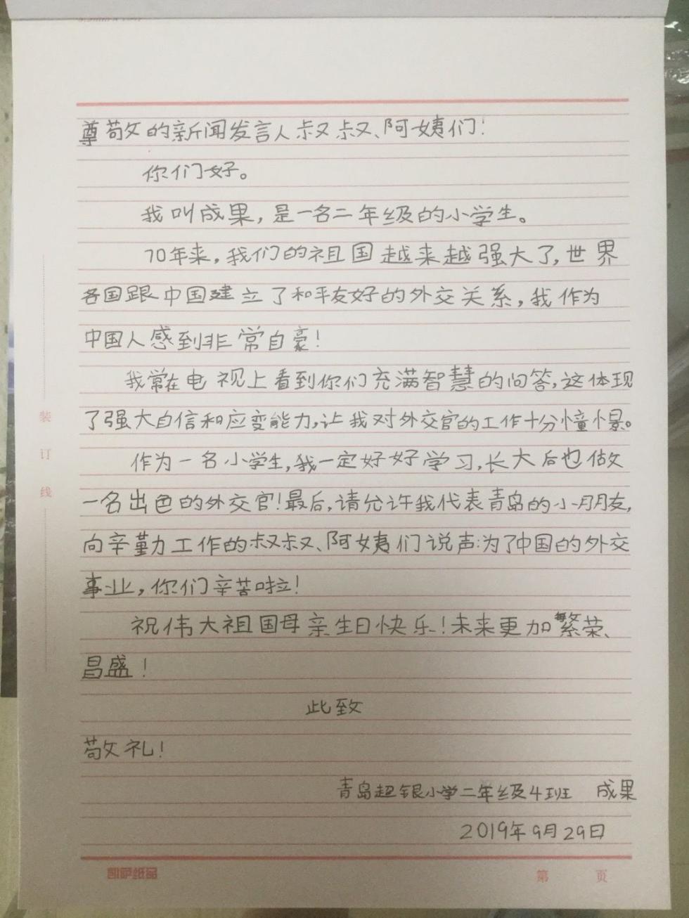 10月28日,记者在青岛超银小学采访了解到,在今年国庆节之前,成果自己尝试着写了一封给外交部的信,在信中她表达了对新中国成立70周年的祝福: