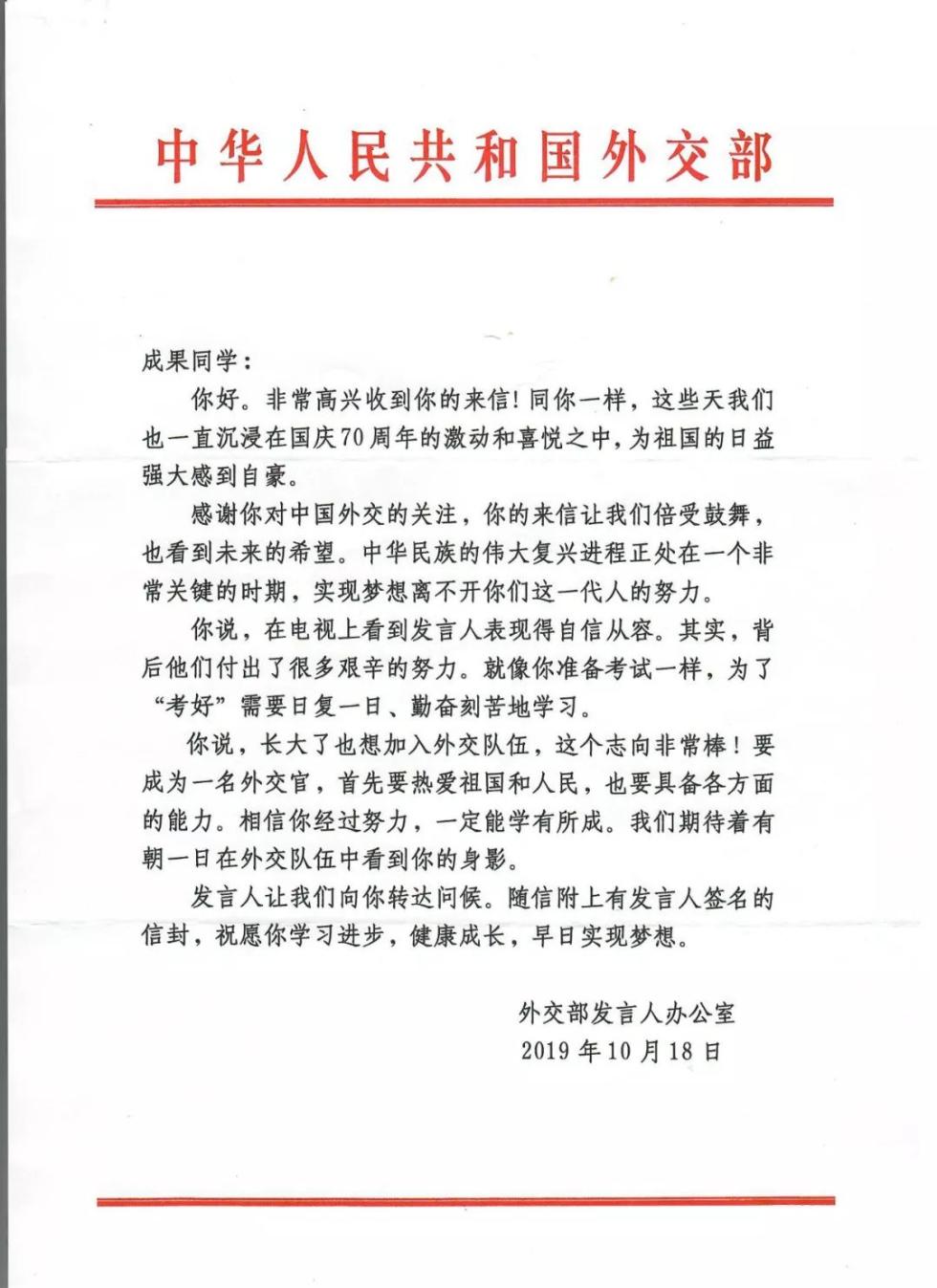 “成果同学,感谢你对中国外交的关注,你的来信让我们备受鼓舞,也看到未来的希望。中华民族的伟大复兴进程正处在一个非常关键的时期,实现梦想离不开你们这一代人的努力。你说,在电视上看到发言人表现得自信从容。其实,背后他们付出了很多艰辛的努力。就像你准备考试一样,为了‘考好’需要日复一日、勤奋刻苦地学习。”