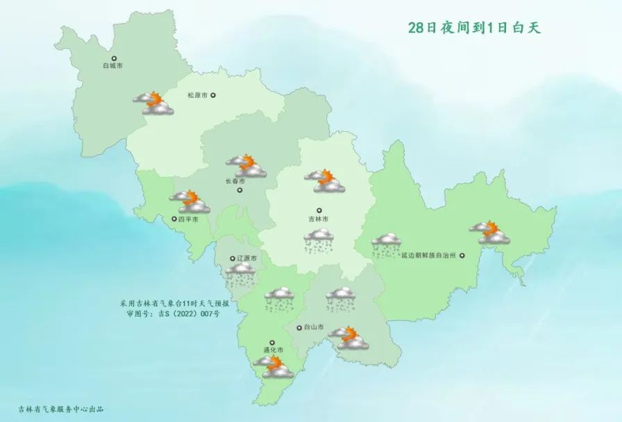 28日夜间到1日白天,全省晴转多云,辽源、吉林南部、通化北部、白山北部、延边西部、长白山保护开发区有雨夹雪,长春南部、四平东部、吉林北部部分地方有雨夹雪。