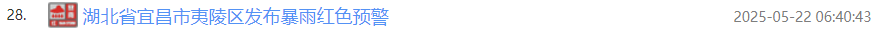 5月22日6时40分,宜昌市夷陵区气象台升级发布暴雨红色预警信号:过去1小时夷陵区黄花镇已经出现60毫米以上降雨,受强降雨云团持续影响,预计未来2小时,夷陵区分乡镇、黄花镇累计雨量将达100毫米以上,小时雨强50到80毫米,伴有雷电、短时强降雨、阵风4到6级,城乡积涝、地质灾害、中小河流洪水风险极高,请加强防范。