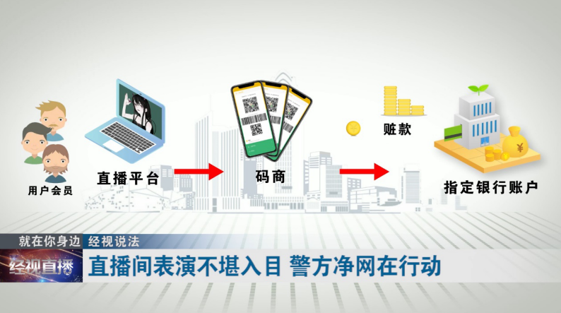 在抓获16名嫌疑人之后,该平台的收付款方式及资金去向逐步浮出水面。原来,该直播平台是通过一个服务平台将资金收取之后,再利用众多的“码商”,也就是用户打赏支付时的二维码商家,将赃款转移到指定的银行账户上,并按照一定比例抽取利润,也就是他们所说的“跑分”