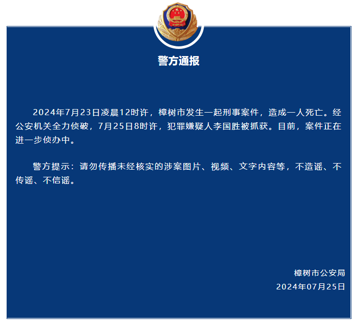 2024年7月23日凌晨12时许,樟树市发生一起刑事案件,造成一人死亡。经公安机关全力侦破,7月25日8时许,犯罪嫌疑人李国胜被抓获。目前,案件正在进一步侦办中。
