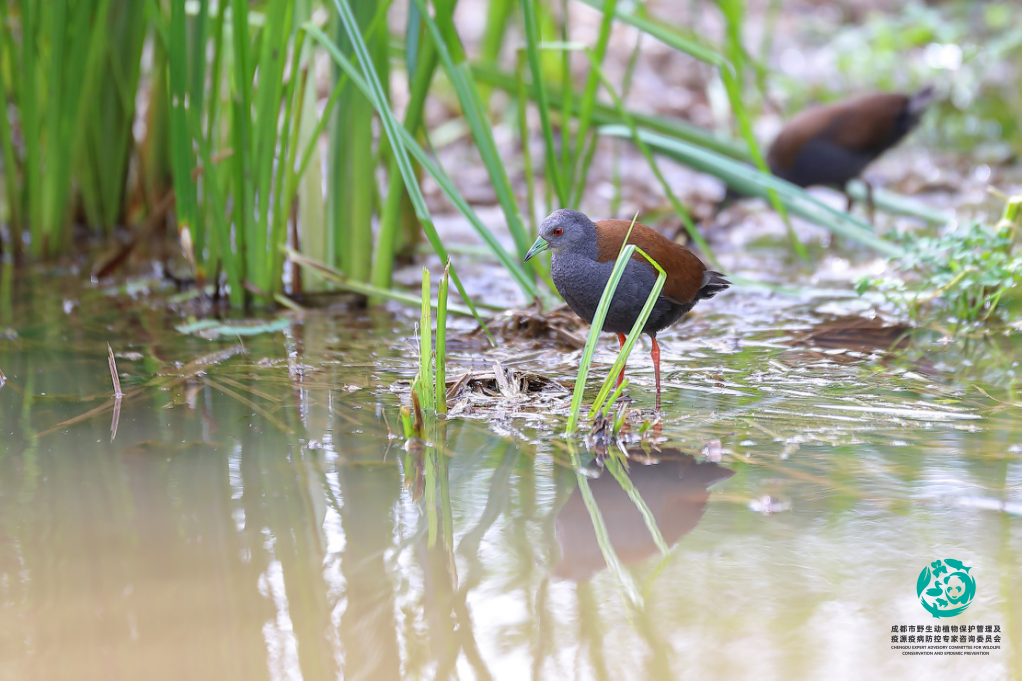 棕背田鸡(Zapornia bicolor),鹤形目秧鸡科。是中等体型的秧鸡,头、颈、腹部为烟灰色,背部为棕褐色,颏白色。性情较隐秘,喜活动于沼泽苇丛中。属于国家“三有”保护动物。监测团队2021年5月在邛崃市首次记录1对成年个体,并持续监测到成功繁殖幼鸟。推测棕背田鸡可能为成都罕见夏候鸟。