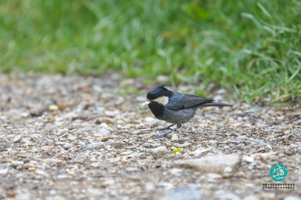 黑冠山雀(Periparus rubidiventris),雀形目山雀科。头、颈部以及冠羽、喉至上胸为黑色,后颈和两颊部各有白色大斑块,身体灰暗,尾下覆羽棕色。是我国西南地区中高海拔较为常见的森林鸟类。属于国家“三有”保护动物。监测团队于2021年7月24日在大邑县观测到2只,为成都市新记录。