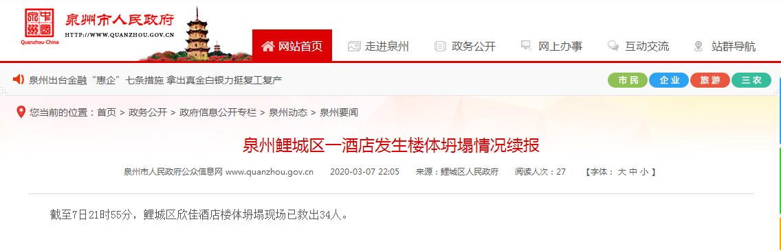 泉州鲤城区一酒店发生楼体坍塌情况续报 现场已救出34人