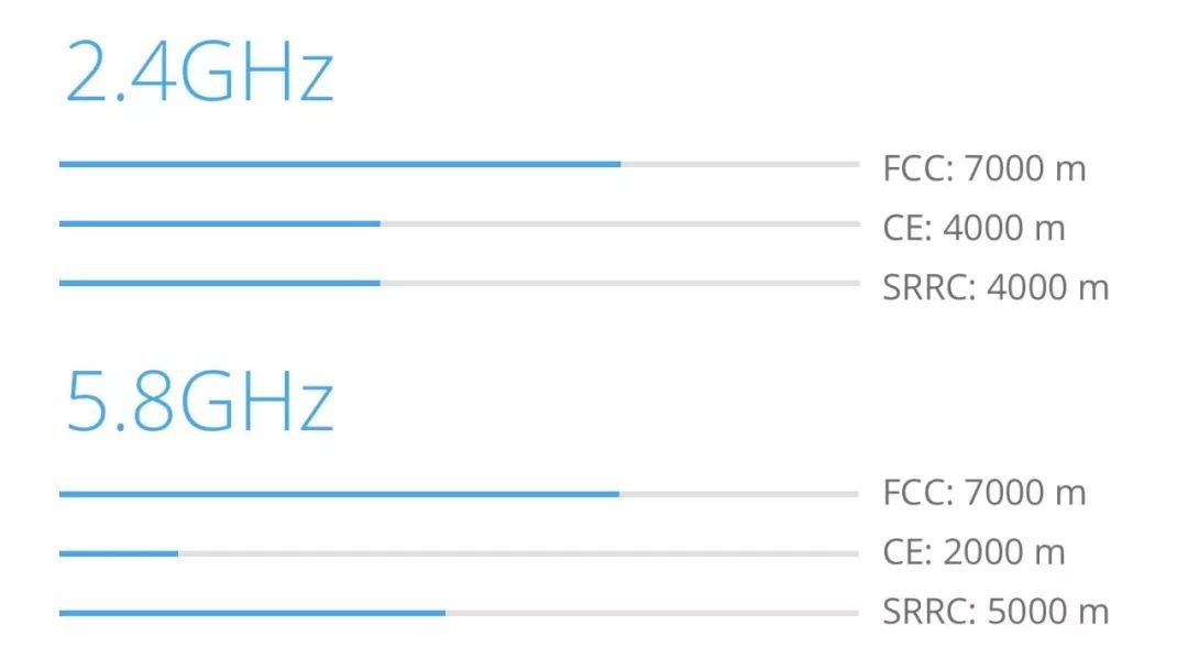 *2.4G&5.8G双频通讯,图像传输与控制距离最高可达7公里。FCC/CE/SRRC分别为美标/欧标/国标,表示在不同国家,距离会有所不同。