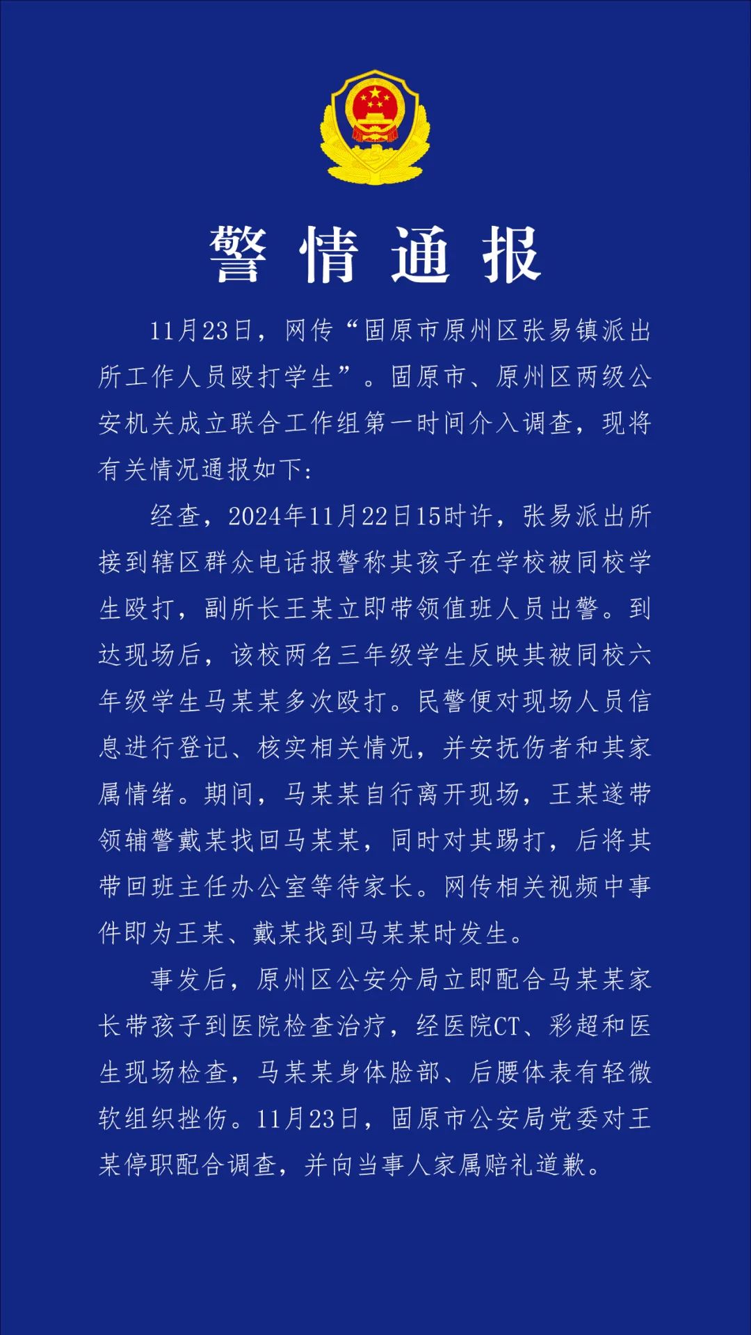宁夏固原警方通报“派出所工作人员殴打学生”:给予当事人王某撤销行政职务处分