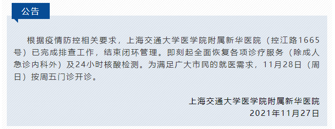 上海交通大学医学院附属新华医院 发布公告:根据疫情防控相关要求,上海交通大学医学院附属新华医院(控江路1665号)已完成排查工作,结束闭环管理。即刻起全面恢复各项诊疗服务(除成人急诊内科外)及24小时核酸检测。为满足广大市民的就医需求,11月28日(周日)按周五门诊开诊。