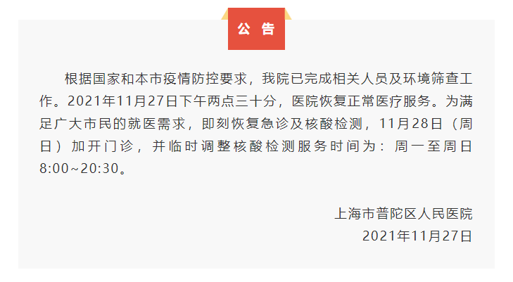 上海市普陀区人民医院 发布公告:根据国家和本市疫情防控要求,医院已完成相关人员及环境筛查工作。2021年11月27日下午两点三十分,医院恢复正常医疗服务。为满足广大市民的就医需求,即刻恢复急诊及核酸检测,11月28日(周日)加开门诊,并临时调整核酸检测服务时间为:周一至周日8:00~20:30。