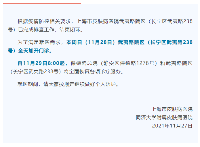 上海市皮肤病医院 发布公告:根据疫情防控相关要求,上海市皮肤病医院武夷路院区(长宁区武夷路238号)已完成排查工作,结束闭环。