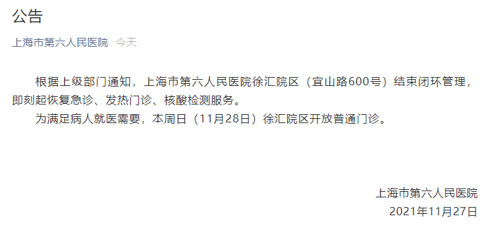 上海市第六人民医院 发布公告:根据上级部门通知,上海市第六人民医院徐汇院区(宜山路600号)结束闭环管理,即刻起恢复急诊、发热门诊、核酸检测服务。