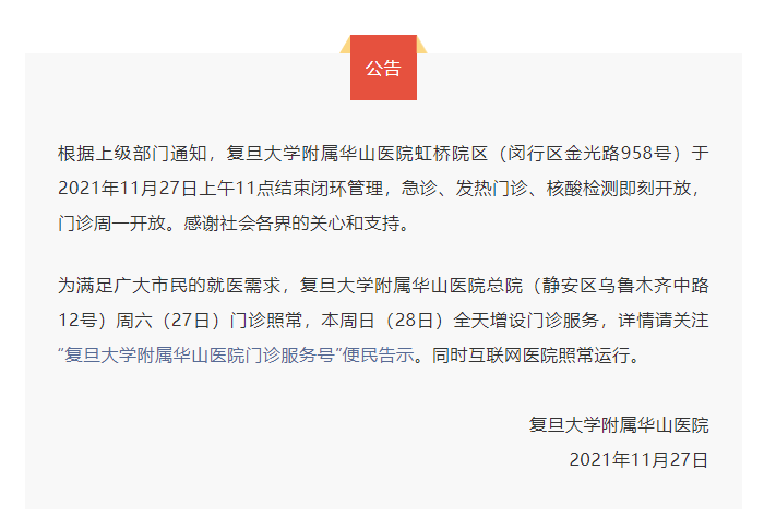 复旦大学附属华山医院 发布公告:根据上级部门通知,复旦大学附属华山医院虹桥院区(闵行区金光路958号)于2021年11月27日上午11点结束闭环管理,急诊、发热门诊、核酸检测即刻开放,门诊周一开放。感谢社会各界的关心和支持。
