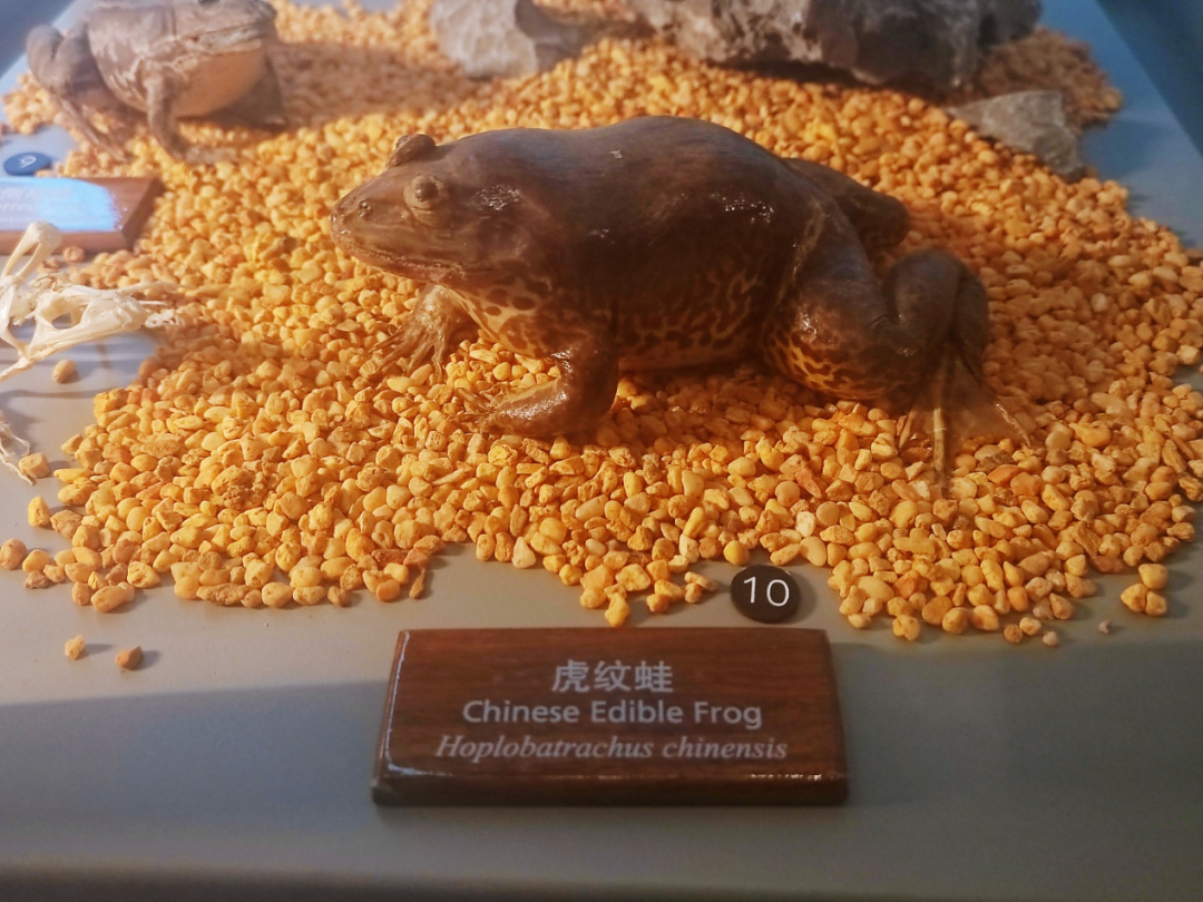 虎纹蛙 是很常见的一种青蛙,又叫“水鸡”。背面多为黄绿色或灰棕色,散有不规则的深绿褐色斑纹,因而得名。它们常生活于海拔900米以下稻田、沟渠、池塘、水库等有水的地方,捕食蝗虫、蝶蛾、蜻蜓、甲虫等昆虫。虎纹蛙蝌蚪则靠摄食水中的原生动物、藻类及有机碎屑等天然饵料为食。后肢的脚趾间有亮亮的薄膜,这就是它的足蹼,说明它是善于游泳的。