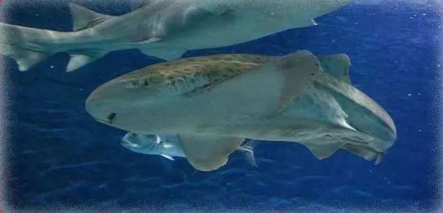 沙虎鲨 有着摄人的“獠牙”、喜欢夜间进行捕猎被称为“黑夜中的杀手”。它们还有个超级厉害的技能就是会吞气,沙虎鲨是众多鲨鱼品种当中唯一可以通过吞咽水面的气体并储存空气在胃部的鲨鱼。沙虎鲨看起来张口獠牙,十分凶悍,可事实上却是个色厉内荏的家伙,性情比较温顺。