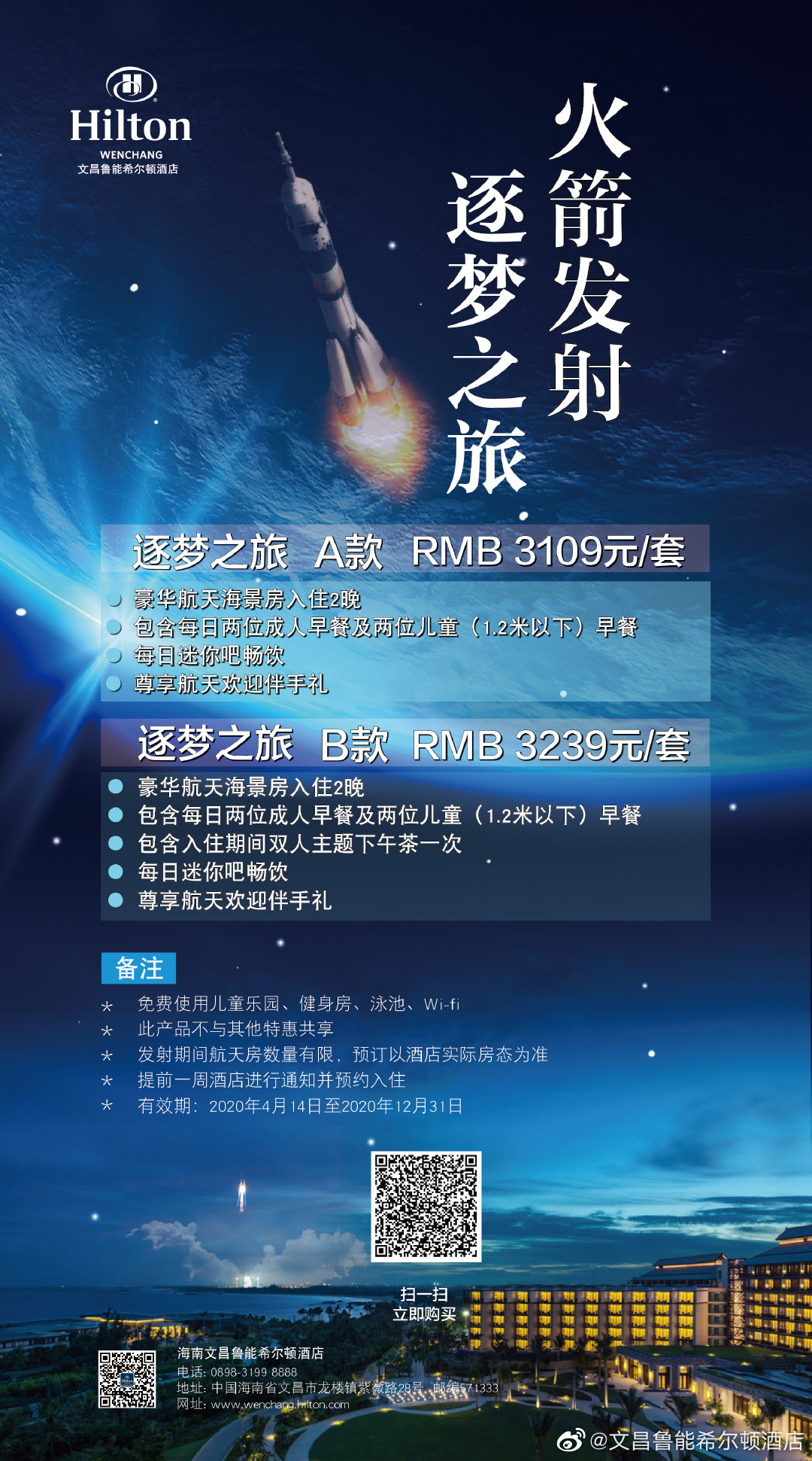 希尔顿酒店推出的“火箭发射,逐梦之旅”套餐。 微博 @文昌鲁能希尔顿酒店 图
