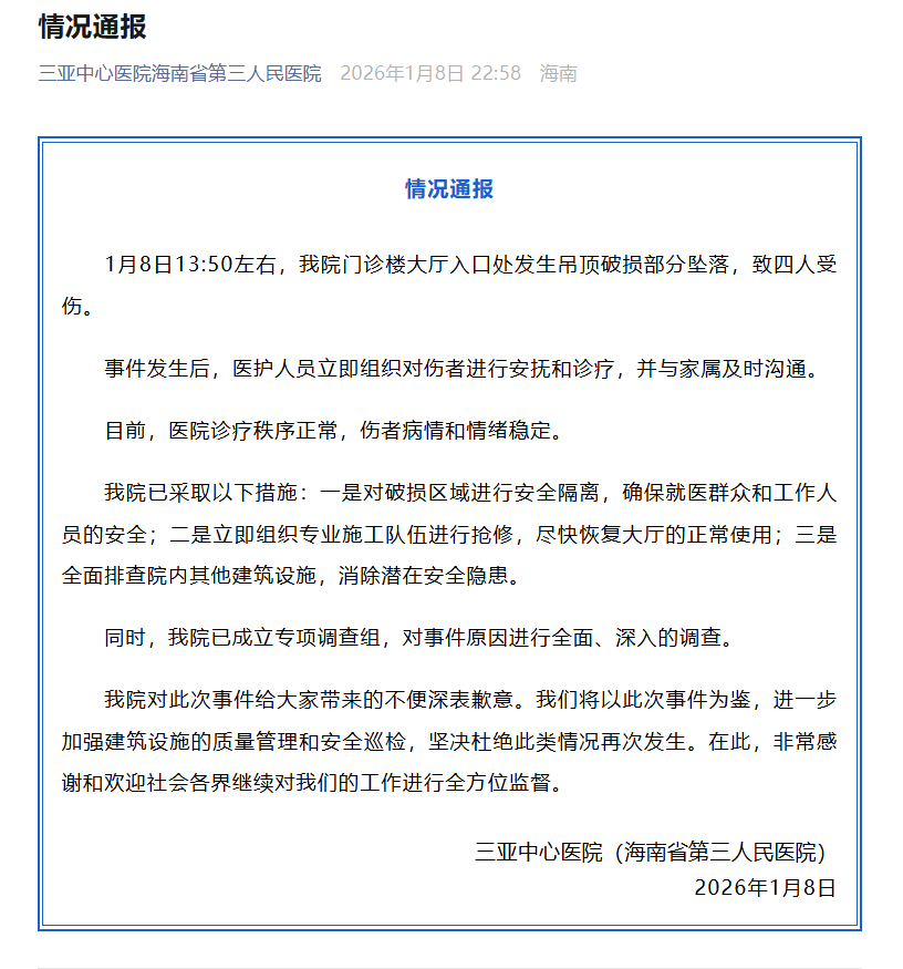 门诊楼大厅吊顶破损部分坠落致4人受伤,三亚中心医院道歉