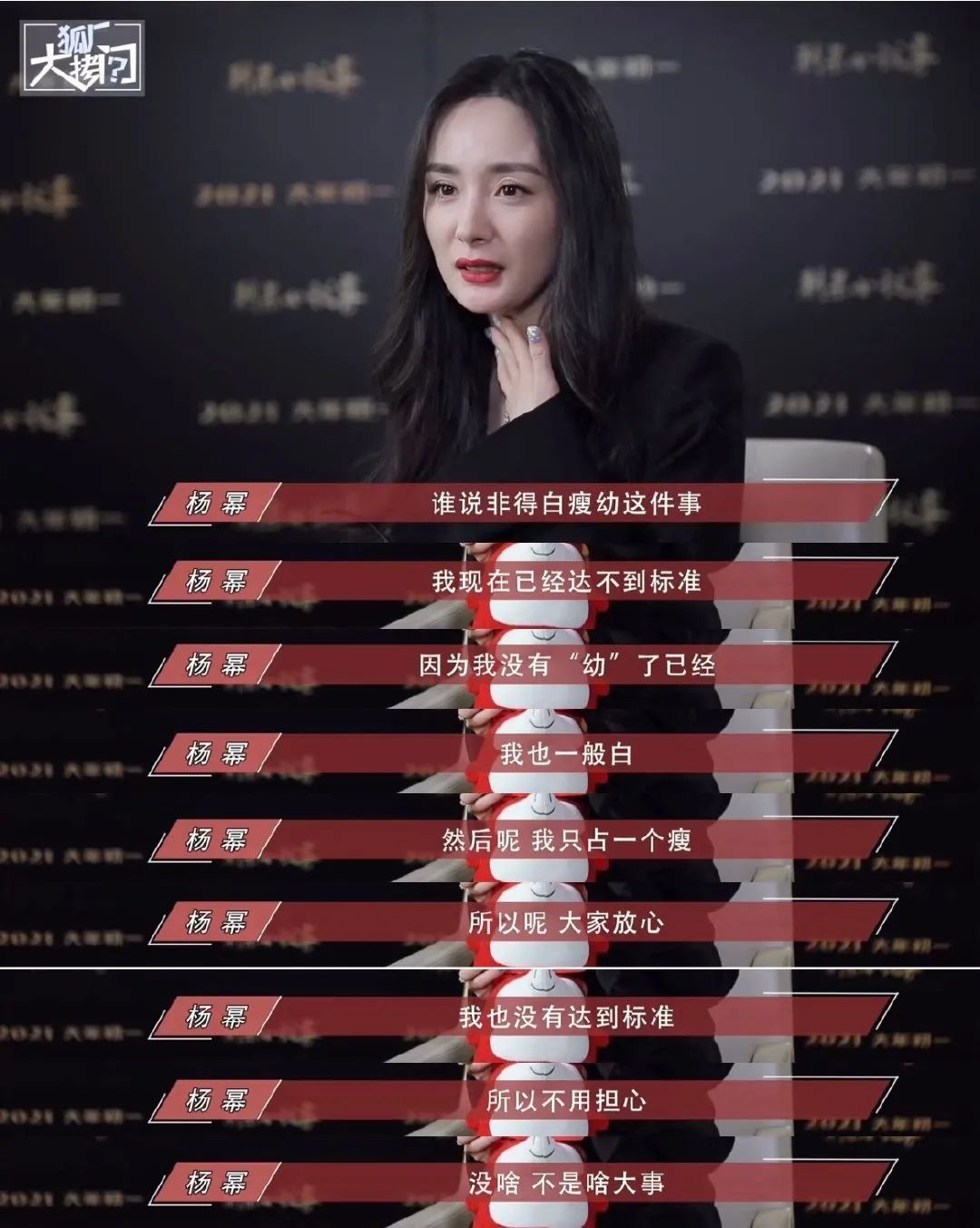 “为什么说女生必须要是白幼瘦,我觉得我可以安慰大家,首先‘幼’这个词儿已经和我没有关系了,‘白’我也一般,我只能占上‘瘦’这个字,所以我也没有达到那个标准。”