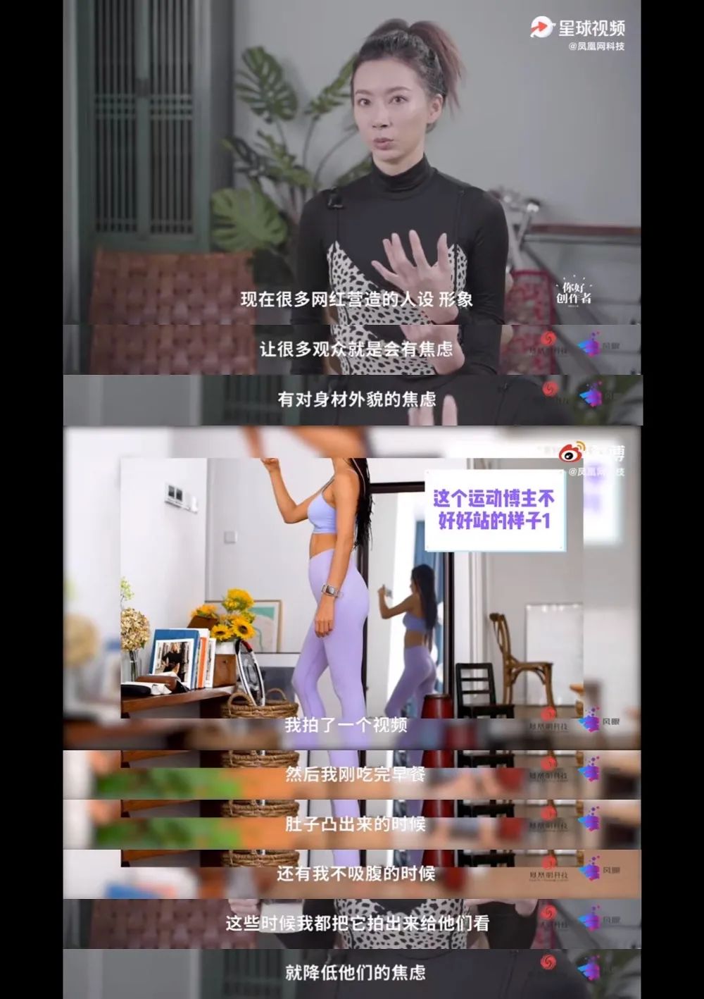 “网络上说很多网红营造的人设、形象让很多观众会有对身材外貌的焦虑,于是我就拍了一个视频,这个视频里有我刚吃完早餐的样子,不吸腹的样子,以及不好好站的样子。”