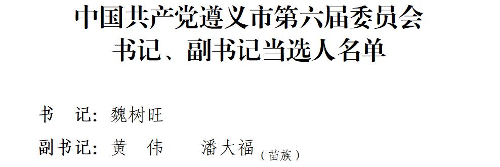 魏树旺当选遵义市委书记 黄伟、潘大福当选副书记