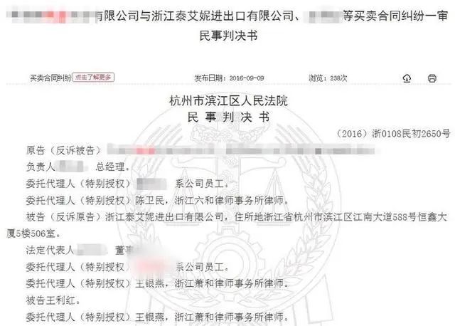 当年8月,案子在杭州市滨江区人民法院一审开庭,杨诚要求泰艾妮赔偿损失。随后泰艾妮反诉杨诚,称其不履行合同义务,未按期交货,构成违约,杨诚公司的账号随即被冻结。