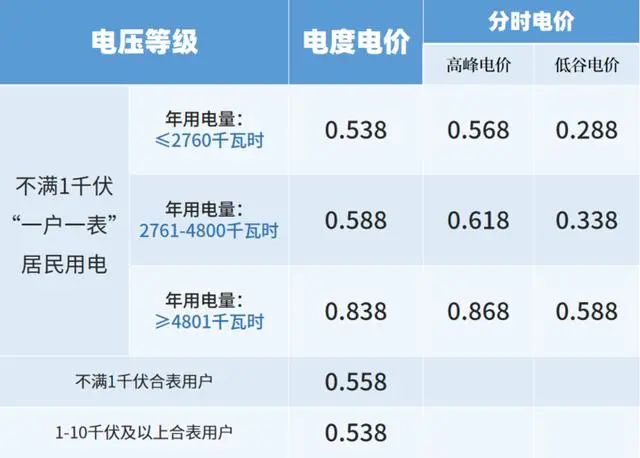通俗来讲,第一档额度为2760千瓦时,该额度以内的用电按照0.538元每千瓦时进行收取;第二档额度为2761-4800千瓦时,该额度以内的用电按照0.588元每千瓦时进行收取;第三档为4800千瓦时以上,用电按照0.838元每千瓦时进行收取。