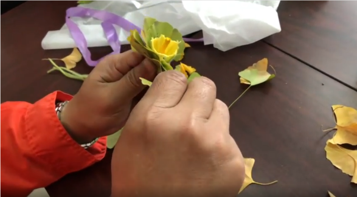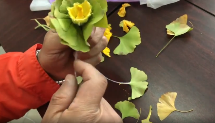 先将各个叶子摆成花朵的形状,再用细绳将它们牢牢地绑在一块。听起来这个步骤似乎很容易,但是实践过程中由于落叶的叶茎表面十分光滑,绑起来特别容易散。