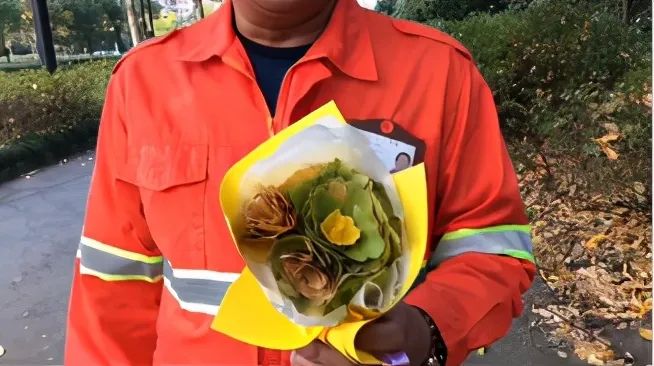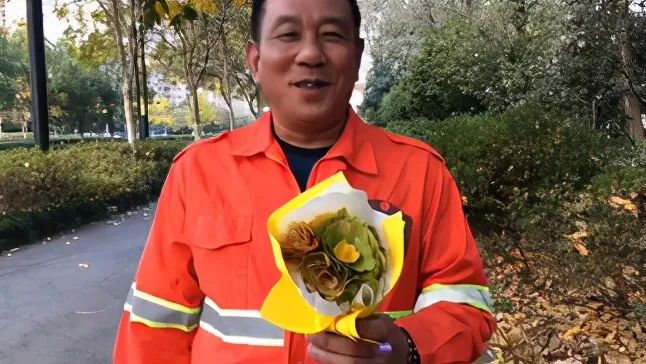 结婚30年第一份生日礼物!环卫工人用银杏落叶编成花,太甜了