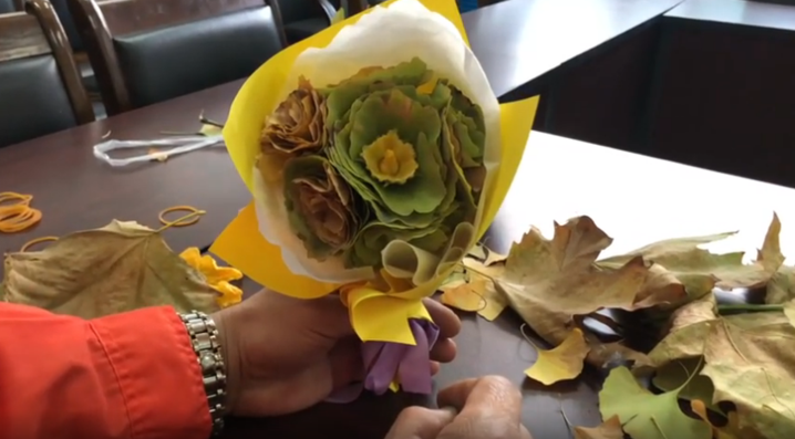 心细的伏祥得还特地将自己在单位种植的南瓜花摘了下来,用作花束最中心的点缀。由于这朵真花的加入,整个落叶做的花束都变得鲜活了起来。