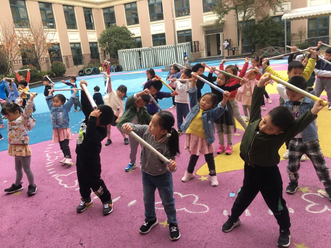杭州紫萱幼儿园 小朋友们的课间操器材,是利用废旧报纸卷成的纸棍。舞着棍子,跟随强节奏的中国风音乐,孩子们舒展身体,迎接快乐的一天。
