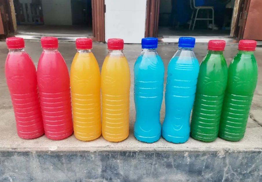 仔细观察会发现,学生手举的哑铃与我们寻常见到的不同,居然是矿泉水瓶做的!将空瓶里灌满颜料水,拧紧瓶盖,就成了简易环保的“哑铃”。每个班的哑铃颜色也不一样,红黄蓝绿,看着五彩斑斓。
