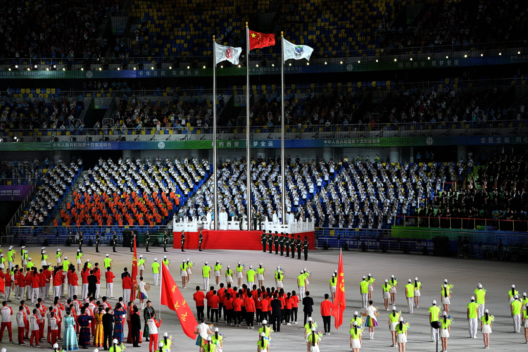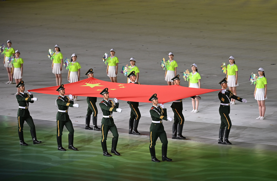 中华人民共和国国旗、中华人民共和国运动会会旗、第十四届全国运动会会旗在开幕式现场飘扬。图源:新华社