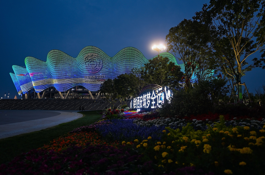 第十四届全运会开幕式在西安举行。这是9月15日拍摄的开幕式前的西安奥体中心体育场外景。 图源:新华社
