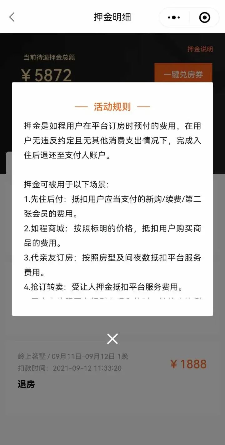 2021年9月份,秦女士预订了莫干山民宿岭上茗墅的房间,共1晚,押金1888元。住了一晚后,秦女士退房,之后三天后押金就退还了。