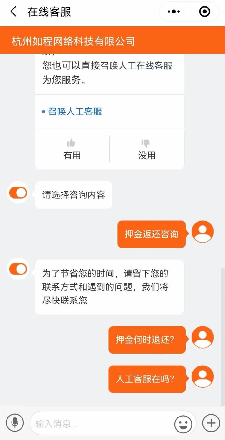 近日,有读者秦女士(化姓)向小时新闻记者报料:在一个旅游住宿小程序“如程”上加入了会员,按规定是在入住签约住房后几个工作日退还押金,但半年过去了,一直没退押金,也联系不到客服,这可怎么办?
