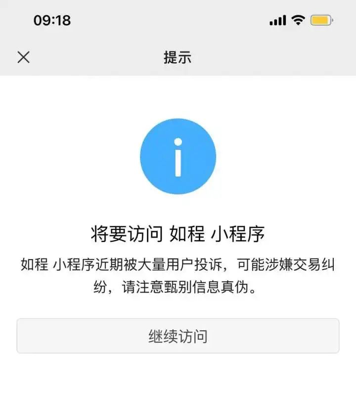 小时新闻记者随后打开小程序“如程”,一打开就提示:“如程小程序近期被大量用户投诉,可能涉嫌交易纠纷,请注意甄别信息真伪。”